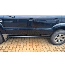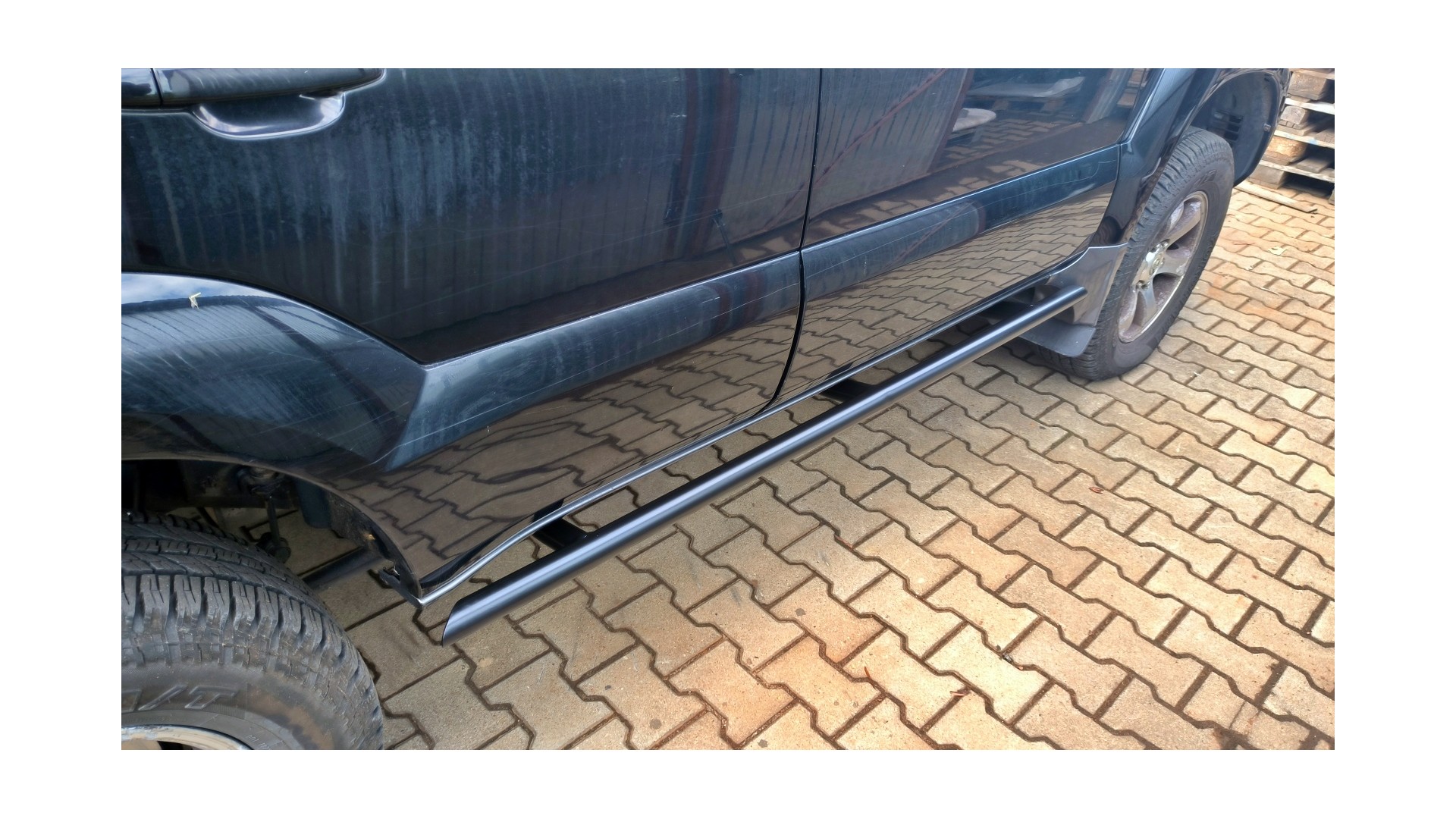 Stalowe progi do pięciodrzwiowej wersji Toyota Land Crusier 120 (J12). Przykręcane do ramy, malowane proszkowo, bardzo mocne i wytrzymałe. Chronią samochód, nie gromadzą błota, można za nie podnieść samochód za pomocą hilifta. Naklejana taśma antypoślizgowa (jak się zużyje łatwo ją wymienić).